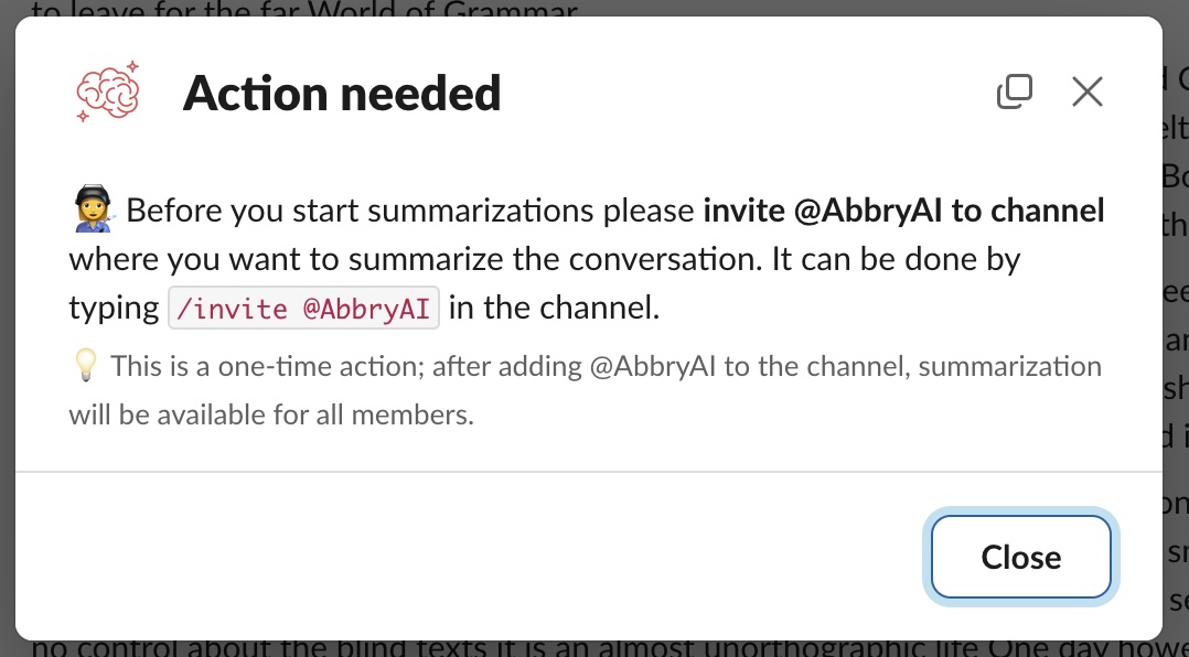 In most cases, you may need to invite AbbryAI to a channel. Type /invite @AbbryAI in the desired channel to do so.