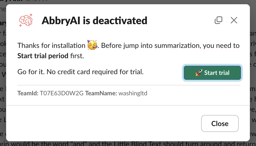 Choose any message and click on Summarize. It will open a dialog with a Start trial button. Let's click on it.