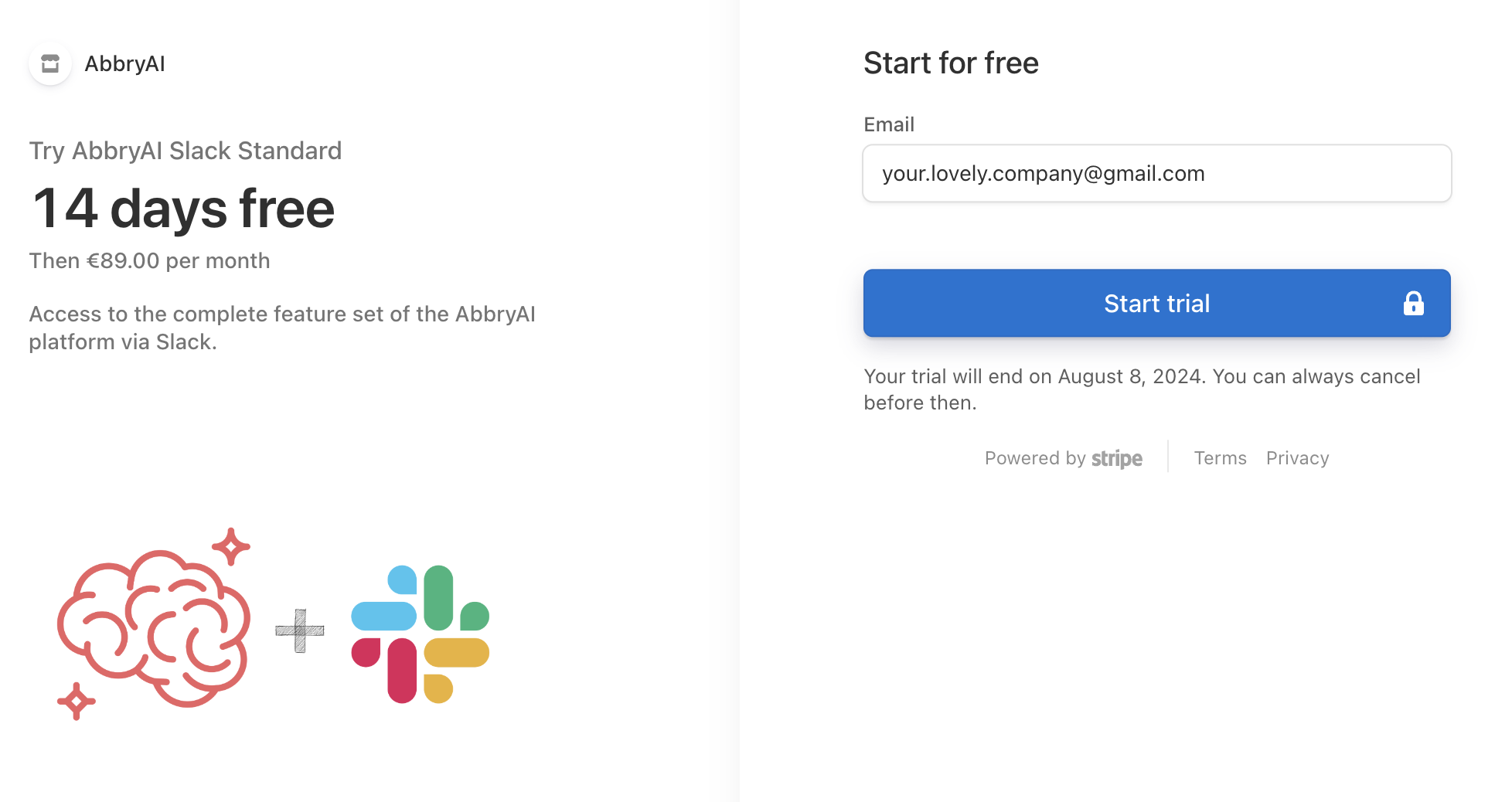 Now is the time to select the Slack workspace you want to install AbbryAI. Write the address of your workspace.
